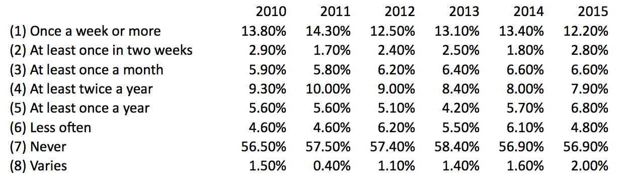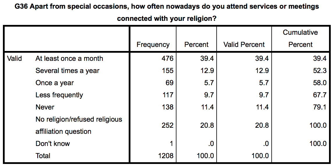 We downloaded data from the British Social Attitudes survey which showed responses to question about attendance at religious services;