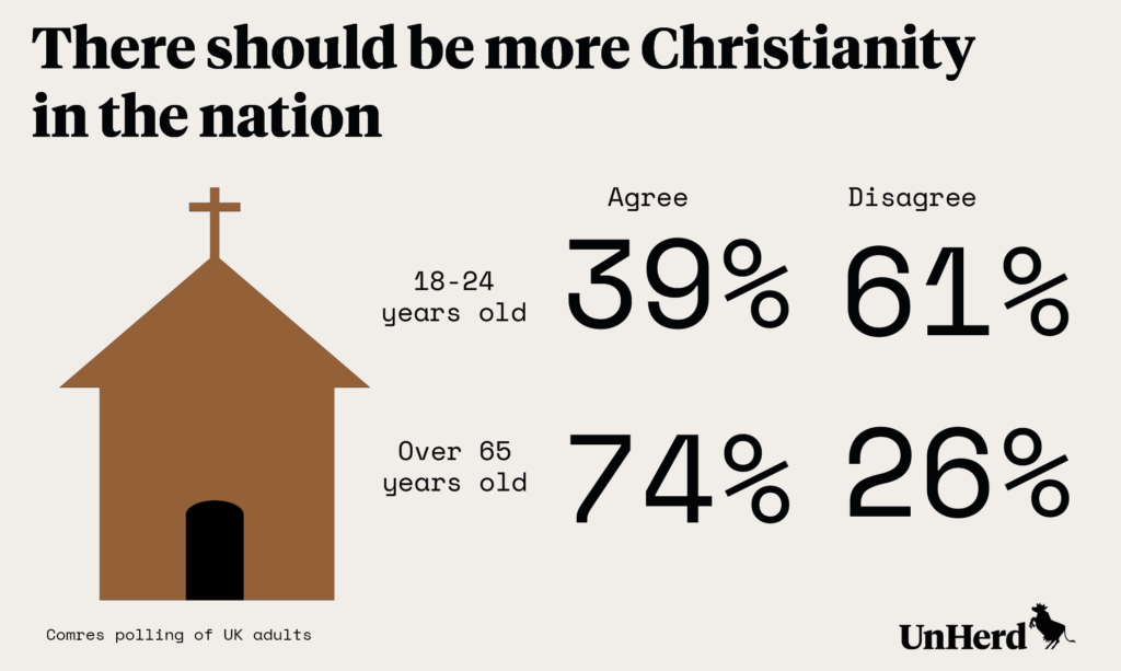 UnHerd today publishes polling from ComRes that suggests the weakness facing Britain’s Conservative Party – among the same age group – run even more deeply with the newest generation of voters holding attitudes on the balance between freedom versus equality; national power; Christianity; and the causes of crime which suggest the Left’s grip on values-generating institutions including schools, universities and the entertainment industry is strong. Very strong.