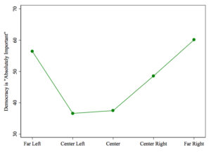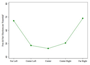 Here again, we find that support for democracy caves at the centre. Compared to 67% at the far-Left and 69% at the far-Right, only 46% of the centre believes that free elections are an “essential characteristic of democracy”.
