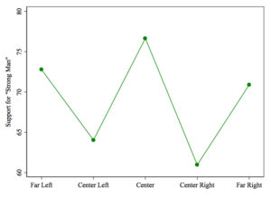 On the topic of strong men, however, the differences between groups are significantly smaller. Seventy-two per cent of the far-Left support a strong leader, and 70% of the far-Right. Even among respondents who sit at centre-Left and centre-Right, overall support does not dip below 60%.