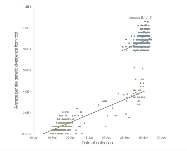 The lighter grey blobs represent the familiar SARS-Cov2 virus, slowly changing at a fairly steady, predictable rate. But the darker blobs are the new strain, B.1.1.7, which was first detected in September. You can see that although it too is changing at a steady rate, at some point before it was detected, it diverged from its parent strain significantly: it has roughly twice as many mutations per location on its genome.