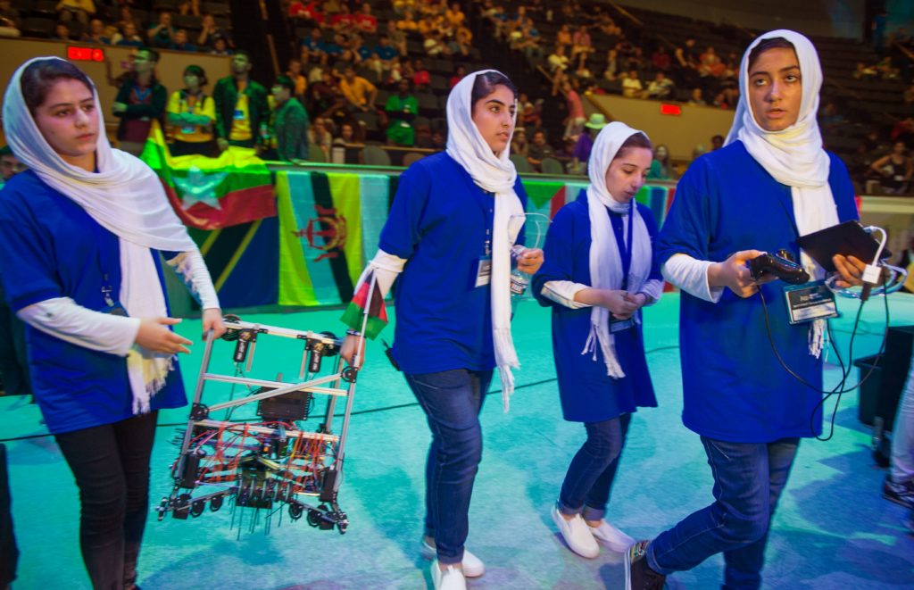 Afghan girls playing soccer. An Afghan woman street artist. An Afghan girls’ robotics team.