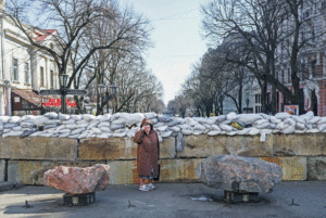 Mounds of sandbags swaddle blocks of concrete. Soldiers stand in groups of two and three, bored but tense, idling but alert. Checkpoints dominate the streets of central Odesa. “Warning! Mines,” reads a sign in front of an especially fortified post near the city’s Bristol Hotel. Large metal crosses — designed to stop tanks — are scattered in the street. Barbed wire stretches across pavements like bunting.
