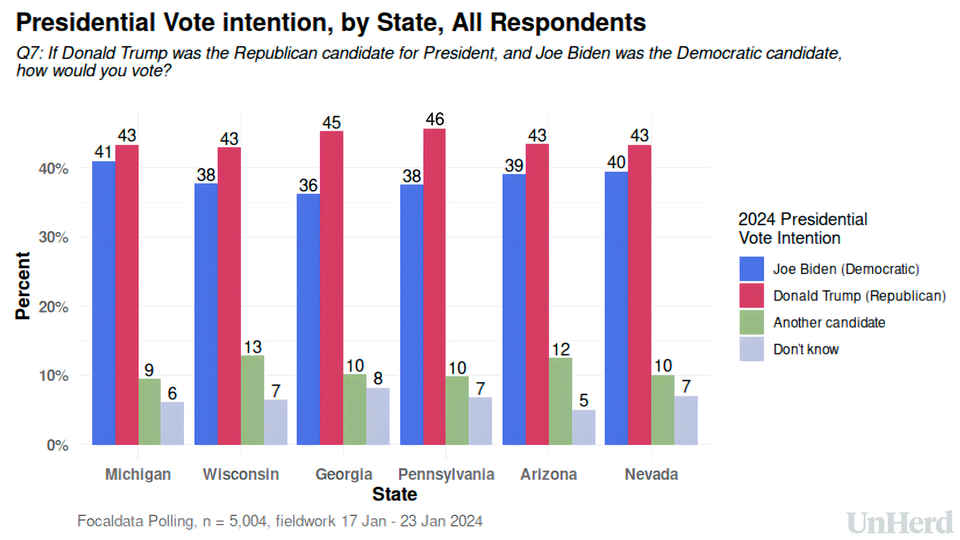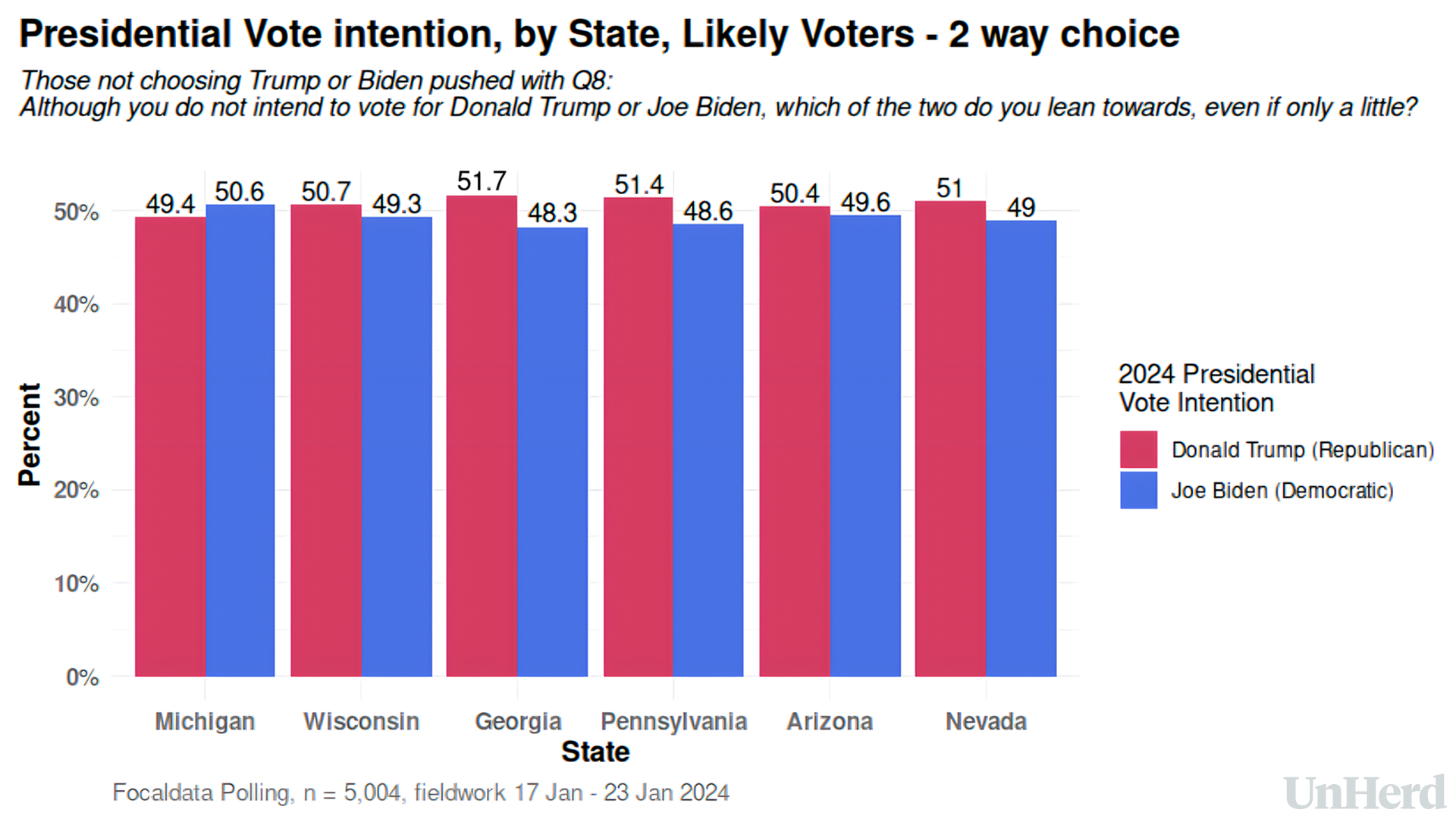 According to most accounts, Biden’s campaign is starting to falter, with Trump maintaining a slight edge in the national polls. But anyone tempted to write off Biden should do so with caution. As a new Focaldata-UnHerd poll of six key swing states reveals, the race for the White House is much closer than the headlines suggest.