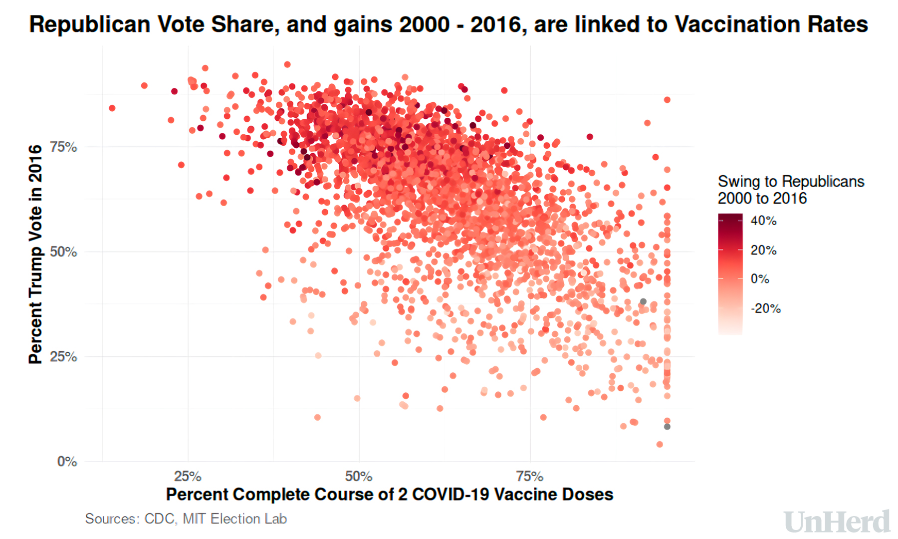 A key measure of this shift are Covid-19 vaccination rates. Many people in the US chose not to be vaccinated, or did not take at least one of the recommended doses. This choice was strongly linked to their trust in the government, media and scientists. The fact that vaccination data is available for relatively small geographical areas makes it an ideal tool to investigate how important “trust” is to politics.