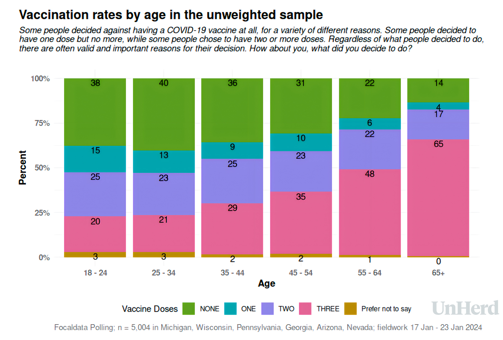 A similar effect, in reverse, may also be leading pollsters to overestimate Democratic support among the over-65s. To make matters thornier, this skew can interact with the vaccination angle. In our raw sample, unvaccinated 18-24s are overrepresented: just half have received two doses, a figure that should be closer to two-thirds. With high-dose young Democrats being less represented in polls, and authoritarian, unvaccinated young adults more represented — it is clear that the young are very likely to be less pro-Trump than polls suggest, and older voters marginally more supportive of Trump than public polls.