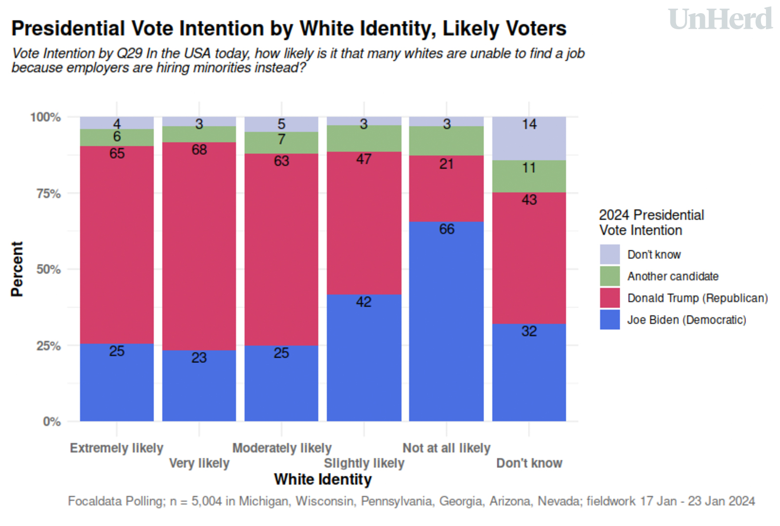 Another aspect of our polling we’ve been looking at is “white identity” — or specifically, the belief that there is discrimination against white Americans. In this survey, we measured this by asking: “In the USA today, how likely is it that many whites are unable to find a job because employers are hiring minorities instead?” The most common response was “Not at all likely” — but responding positively to any extent is a strong predictor of voting for Trump, both in 2016 and 2020.