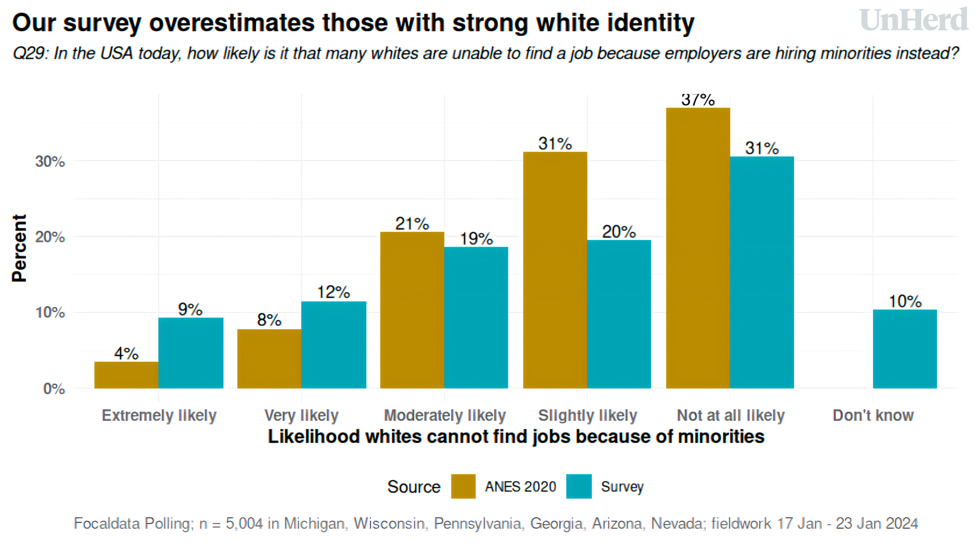 What’s really interesting here, however, is that polls may be overestimating the percentage of people — particularly white people — who are hostile to affirmative action, and who believe their job prospects are hindered by minorities. If that’s the case, then we might expect a very different kind of polling error this cycle. When we look at the incidence in our survey compared to those in the general population (as measured by the ANES 2020 survey), we are over-sampling those who answer “extremely” and “very likely” (and particularly so in Pennsylvania).