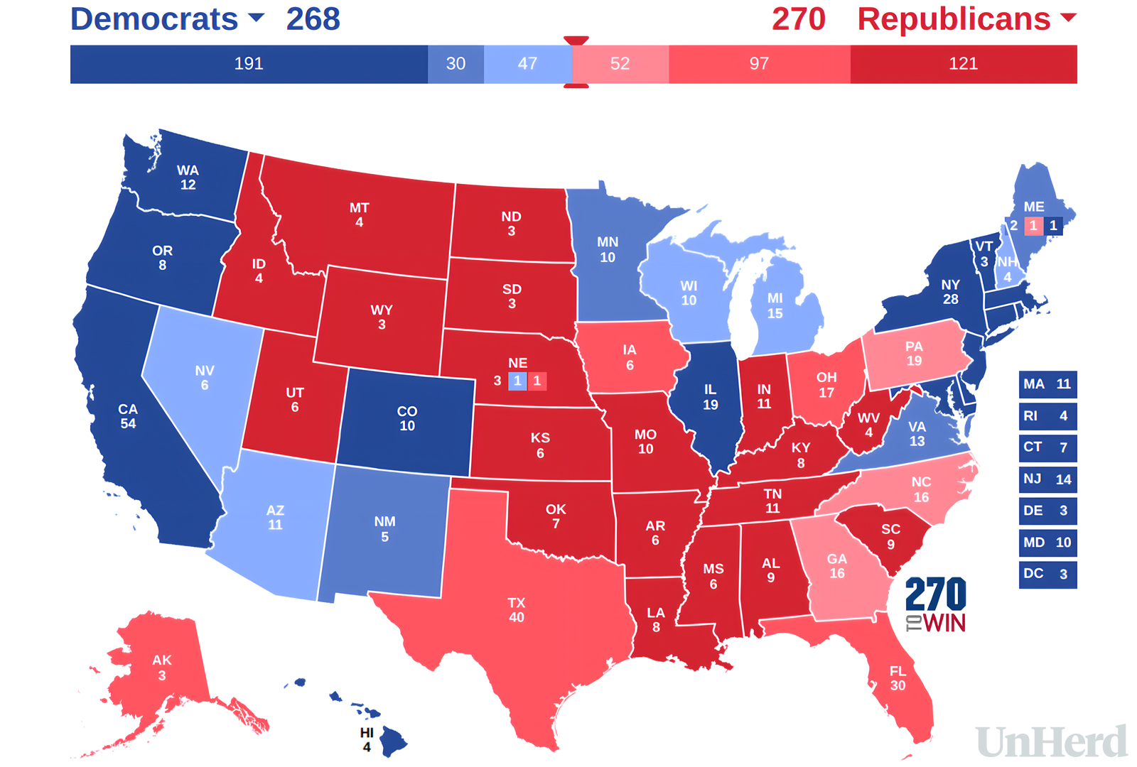 Indeed, that 3.75% average is heavily tilted towards the massive incumbency gains made by Reagan in 1984 (7%), and Clinton in 1996 (9%), two of the greatest orators of the 20th century. Is that really replicable? When you step back, this election surely has more in common with George W. Bush’s in 2004, which resulted in a modest 2.5% pickup. And if that does happen, it could result in the closest electoral college map in history, with constitutional chaos bound to follow.