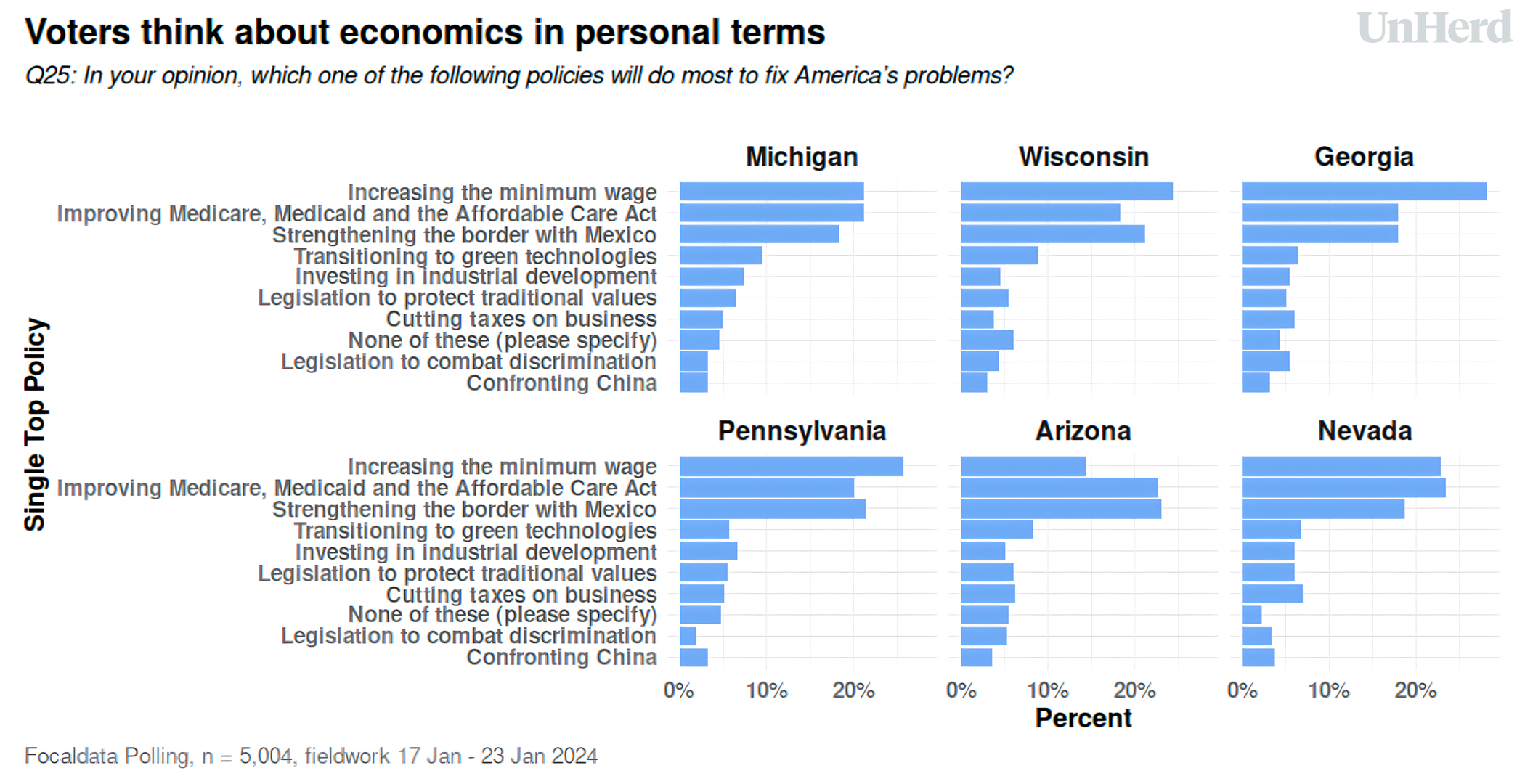 And this is where things get tricky for Biden. For while his flagship policies involve investment in the economy, voters do not associate these policies with the cost of living. Half of respondents (51%) picked the cost of living among their top-three issues in our poll, almost 20% more than the next most important issues, immigration and healthcare. However, when respondents were prompted to pick a policy, they chose direct income — a higher minimum wage, or improving the Affordable Care Act — over industrial or green investment, by a large margin.