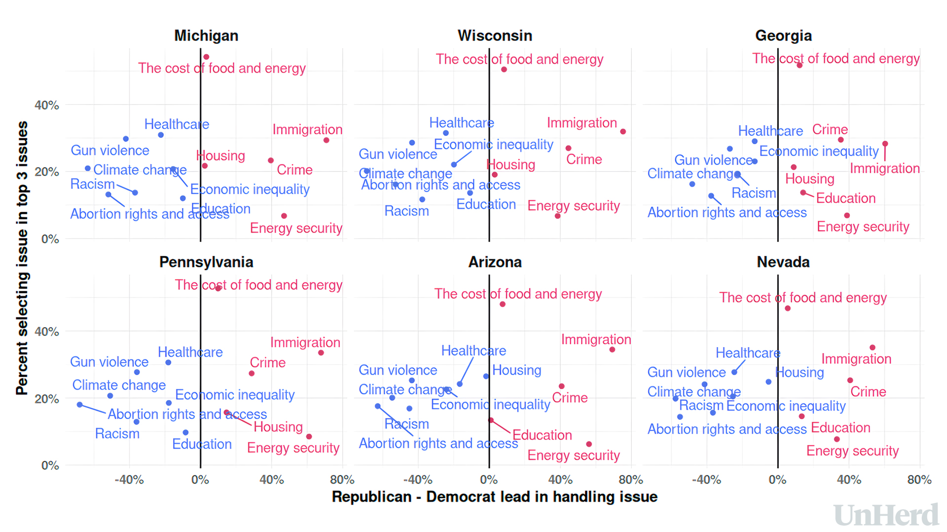 There is a lot of collinearity here: those who rate Biden poorly are also very likely to think that Republicans will better handle the cost of living. But the overall message is that it’s a very personal election: people are not voting for Biden because they don’t think he’s done a good job when it comes to the cost of living. Reversing this is key.