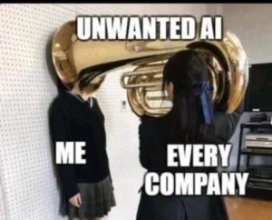 There’s a good meme about it, which shows a small girl pinned against the wall of a school corridor by a tuba jammed into her face. The victim is labelled “Me”; the tuba is labelled “Unwanted AI”; and the person holding the tuba is labelled “Every Company”.