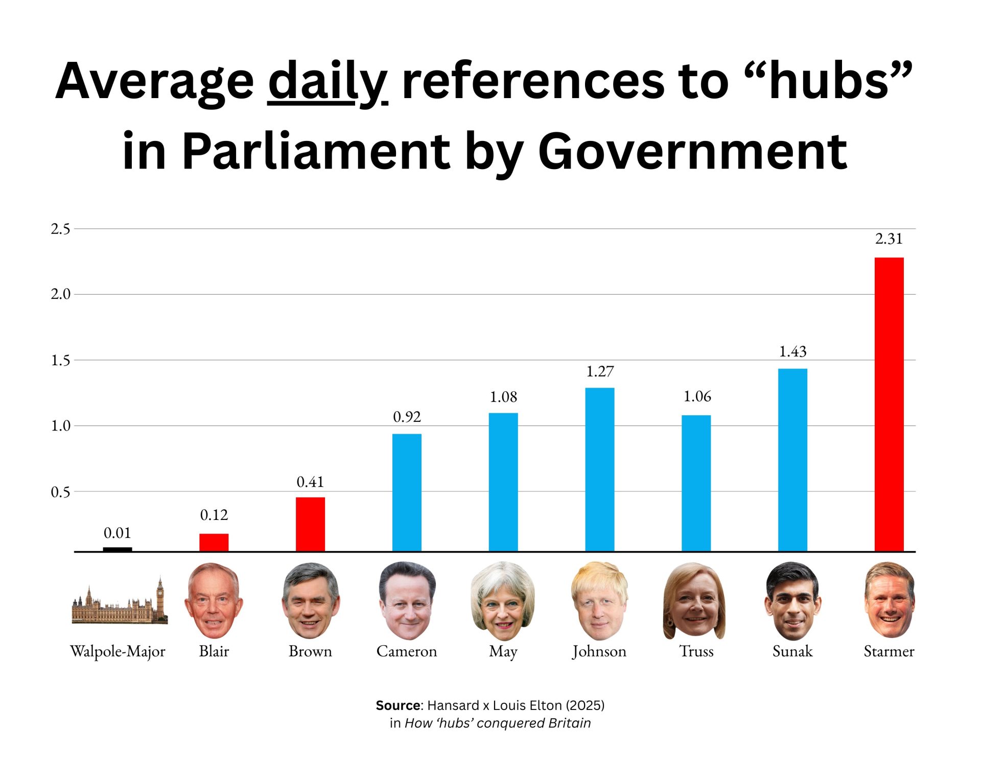 In just one year since Starmer entered Downing Street, “hub” has appeared 966 times in parliamentary debates. In June 2025 alone, it popped up 166 times — the highest month since records began. At this pace, the term may feature over 4,000 times before the next election. So inundated by hubs, we are numb to them. Ubiquitous and bland, they’re an instant eyeball glazer.