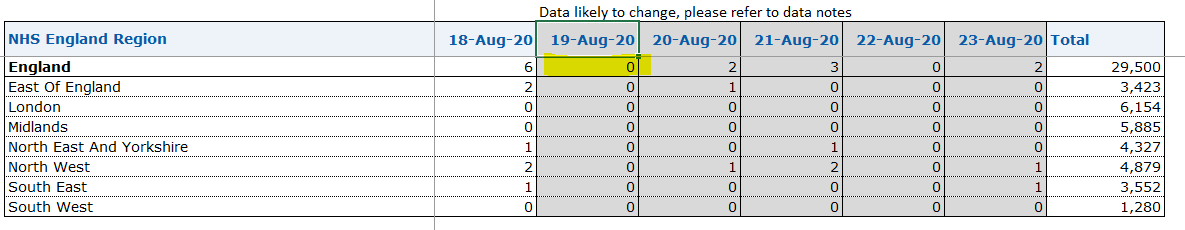 Update: Sadly — as we said was possible — a single death has been added to the NHS England figures for the 19th August in West Herts