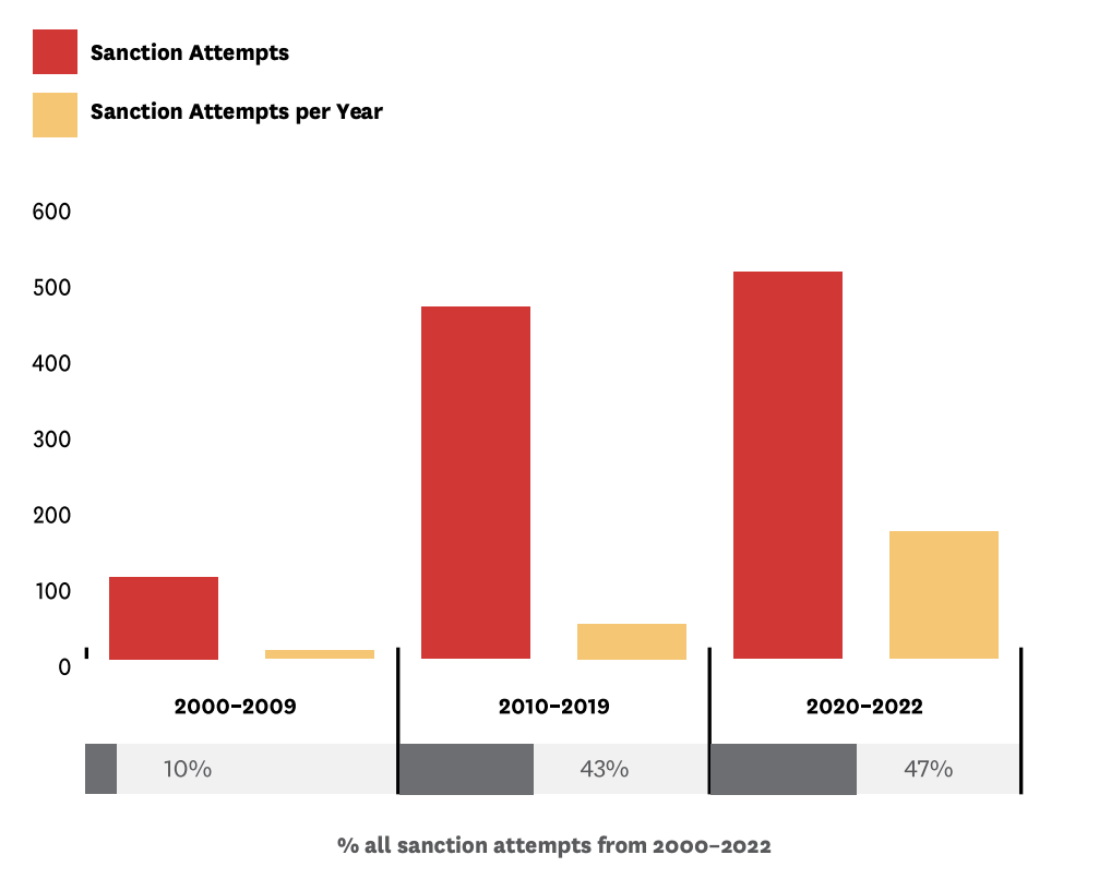 While those initiating the sanction attempts largely come from the Left within institutions, a growing number have been coming from the Right outside of it. The graph below shows the pace at which Government officials from the Right have started sanction attempts: in the last three years, there have been 39, already comfortably ahead of the previous decade’s total.