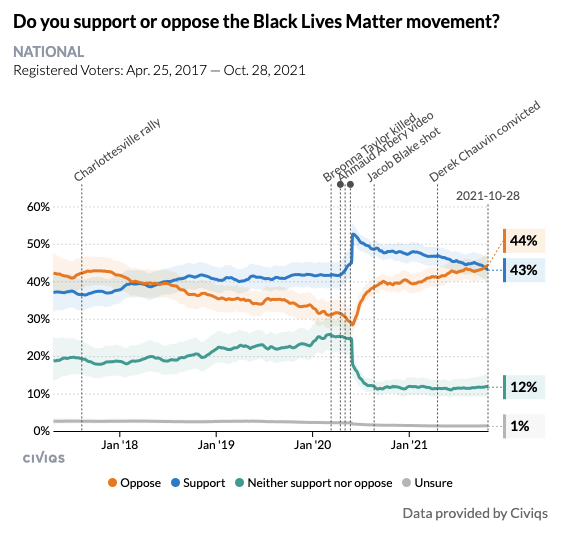 The researchers did not specify whether the question referred to BLM the broad philosophy, the organisation, or the protests, but it represents a significant shift in a short period of time. Alongside the dramatic drop in public support for President Biden since his election, observers will be keen to see if it represents a broader shift in political attitudes ahead of the midterms next year.