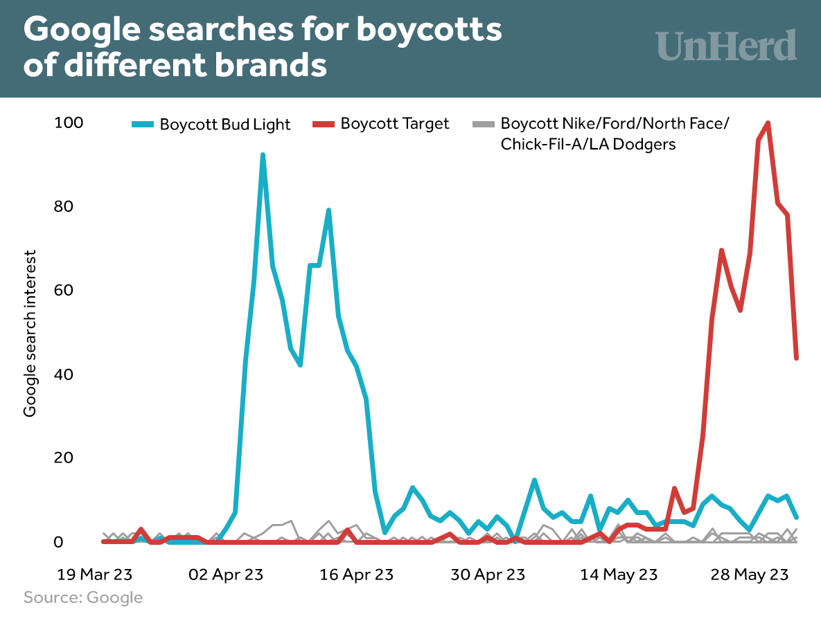 One way to gauge the scale of these boycotts is by using Google search interest. As the chart below indicates, only the Bud Light and Target boycotts have really gained momentum. None of the others is associated with a spike in search interest.