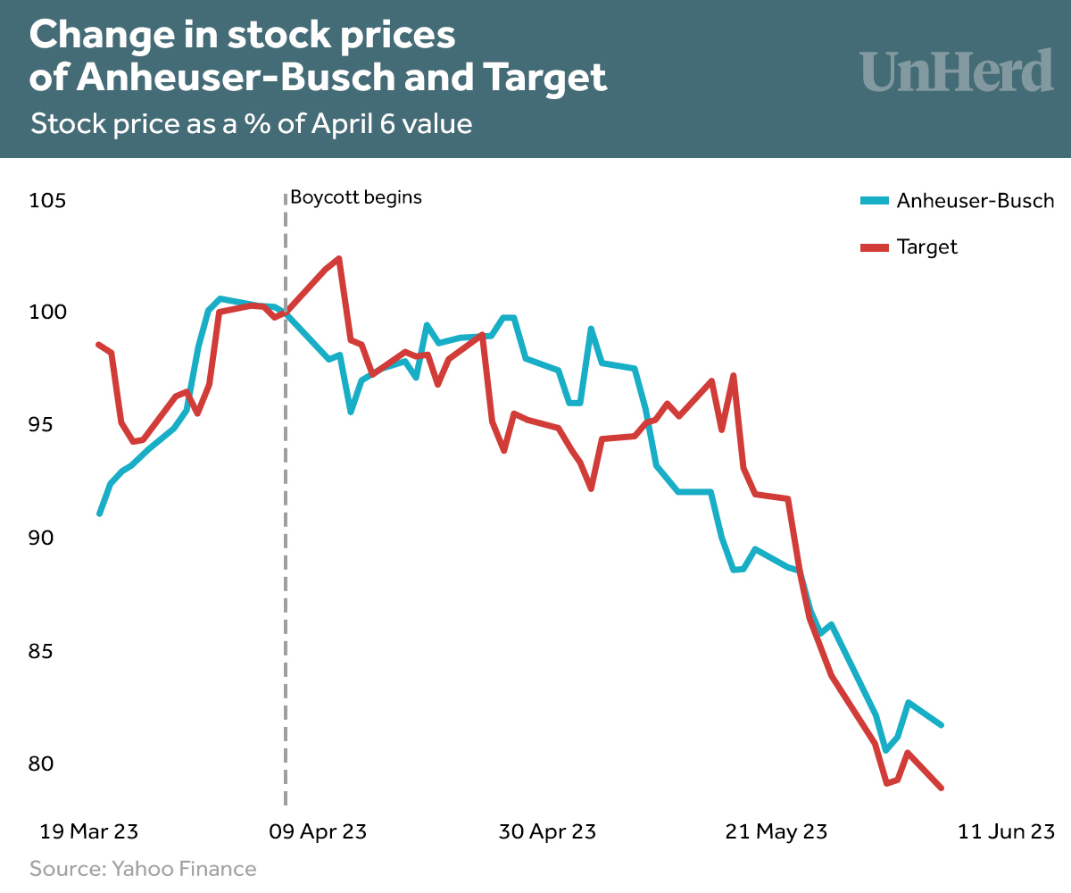 Since 6 April (the date corresponding to the first spike in search interest for “boycott bud light”) Anheuser-Busch’s stock price has fallen by a massive 18%, while Target’s has fallen by an even greater 21%. Over the course of only two months, these companies have lost around a fifth of their value.