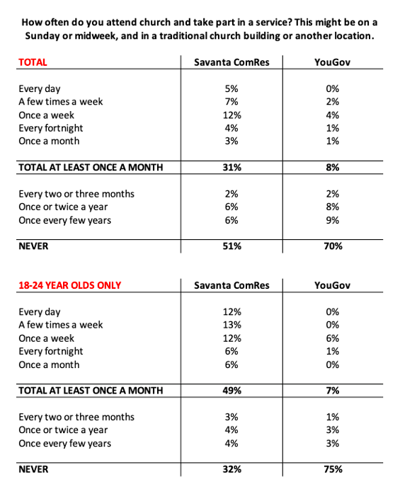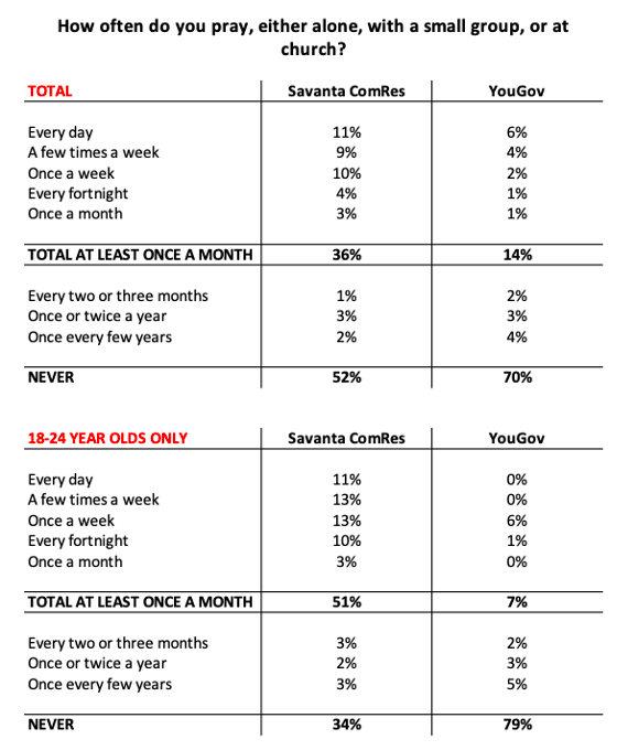 YouGov found that 7%, not 51%, of 18-24 year olds report praying at least once a month, and 7%, not 49%, of 18-24 year olds attend a service of worship once a month. Among the whole British population, 14% of people say they pray once a month or more, not 36% as Savanta ComRes reported; and 8% attend a church service of some kind, not 31%. I’ve pasted the results in comparison below if you’re interested in the details. The error is so massive, and flies so much against common sense, as to demand the question: how did Savanta ComRes allow it to be released?