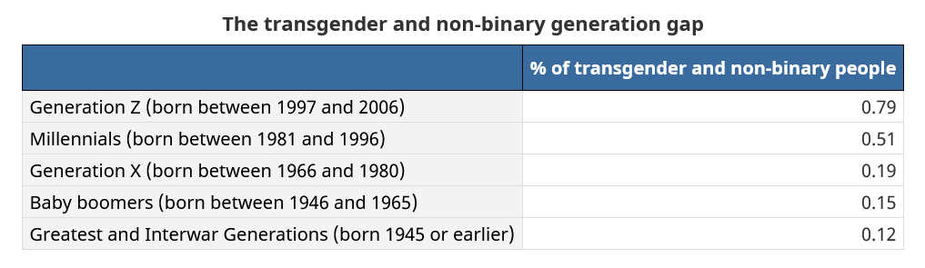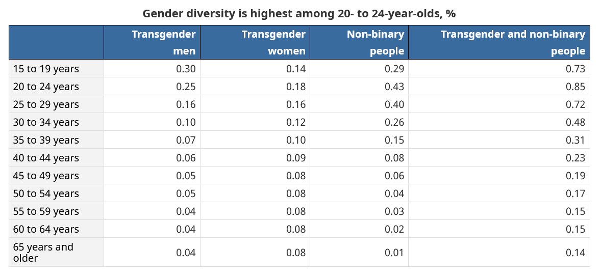 What’s more interesting, though, is the breakdown by age and sex. Young people are much more likely to be transgender. I think we could have guessed that, but now we have the numbers to prove it. Statistics Canada labels it a “generation gap”.
