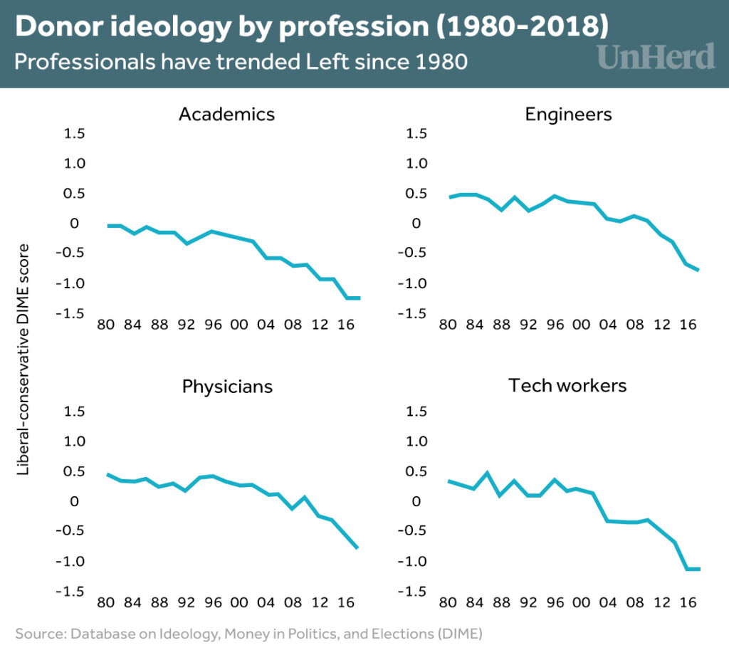 My research strongly suggests that what is occurring is an international phenomenon, not something specific to Trump or even the US. And donations data, which measures those who are politically active, indicates that professions like law and medicine are becoming more similar to academia and the media.