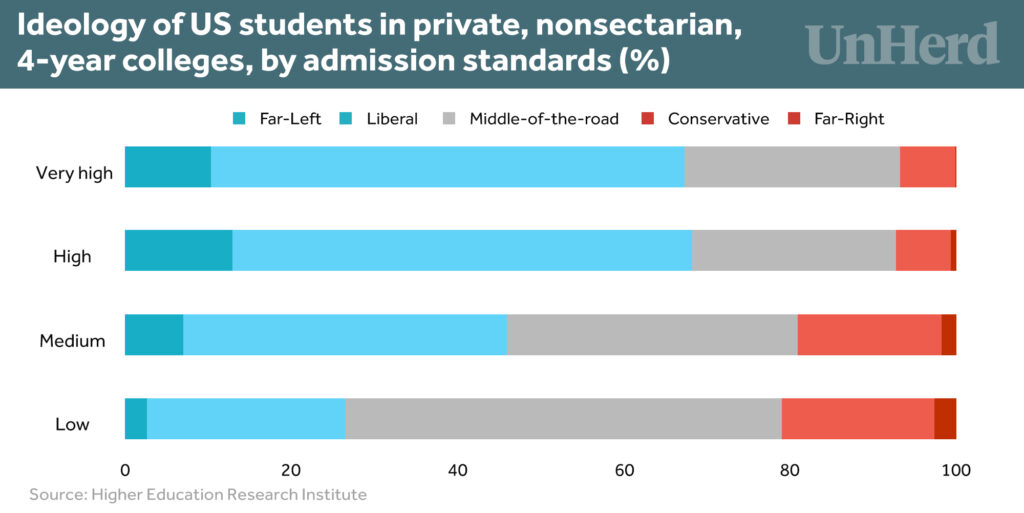 Those who are younger or attend elite schools are closer to this culture and therefore tend to be more Left-wing. The figure below shows that among American first-year students, 67% of those attending highly selective colleges are liberal or Left-wing, compared to under half from medium-selective colleges and just 27% attending low-selective colleges (where conservatives are almost as numerous as liberals).