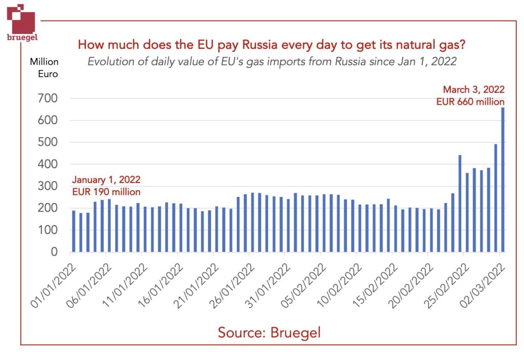In a follow-up tweet, Tagliapietra explains that the price of gas via long-term contracts lags the ‘spot price’ — meaning that the exporter doesn’t immediately get the full benefit of any surge in current market value. However, the fact remains that the countries of the EU are still sending the Russians hundreds of millions of dollars every day.