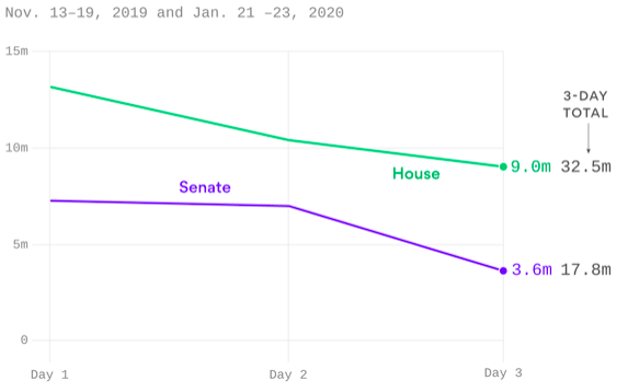 First, the public overall are tuning out, as this new data for Axios shows (above). This is a long way from the wall to wall tabloid coverage of the Clinton impeachment (during which Bill’s approval went up anyway).