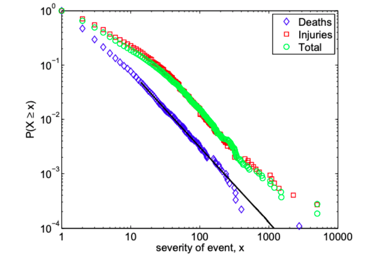 Interestingly, we can make a decent stab at this. Terrorist attacks, like earthquakes and meteorite strikes, follow a power-law distribution. Small ones are common, but larger ones get rapidly rarer, with (according to this 2006 paper, anyway) a scaling parameter of 2.5. That sounds complicated but it just means “a terrorist attack that’s twice as large is about 2 to the power 2.5 (about 5.5) times as unlikely”. This paper finds something similar.