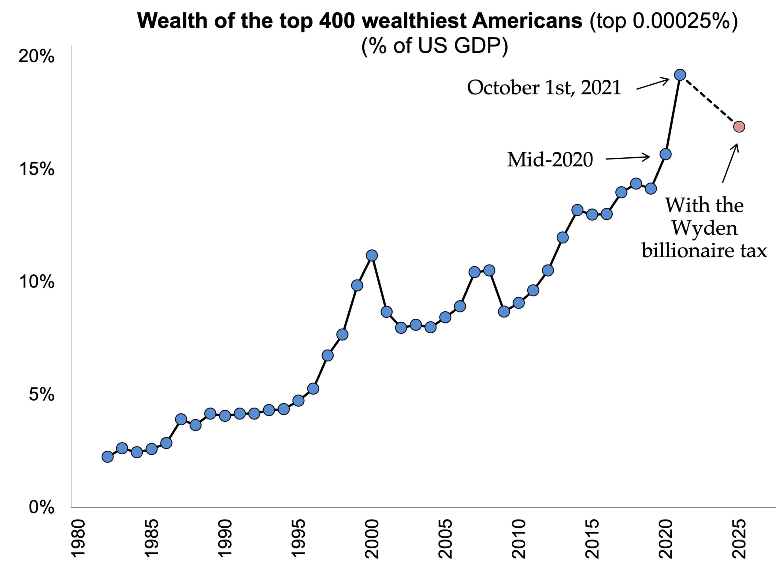 In theory, this could raise hundreds of billions of additional revenue for government. However, it’s not exactly a programme of total expropriation. According to the economist Gabriel Zucman, this is the impact it would have on the wealth of the 400 richest Americans as a percentage of national GDP: