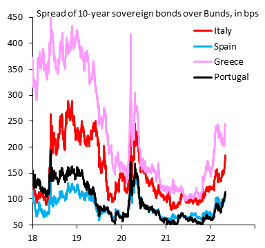 Given the current talk of recession, is there any sign that a second Eurozone crisis might be brewing? A chart tweeted out by Robin Brooks shows that the spread between German government borrowing costs and those of the Mediterranean countries is getting wider again: