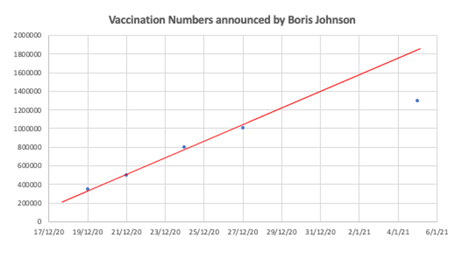 In the following week, things sure looked like it. Two days later, on 21st December, the Prime Minister announced a new total of 500,000 vaccinations. Three days after that, on Christmas eve within his statement on the EU trade deal, he announced “nearly 800,000” vaccinations.