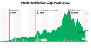 Pre-pandemic, Moderna was a $9 billion company. But by the time Covid had spread around the world the biotech company’s value grew to $35 billion. Then came the advent of the vaccines, of which Moderna was one of the leading manufacturers, and the company’s net worth soared to an eye-popping $195 billion in September of 2021.