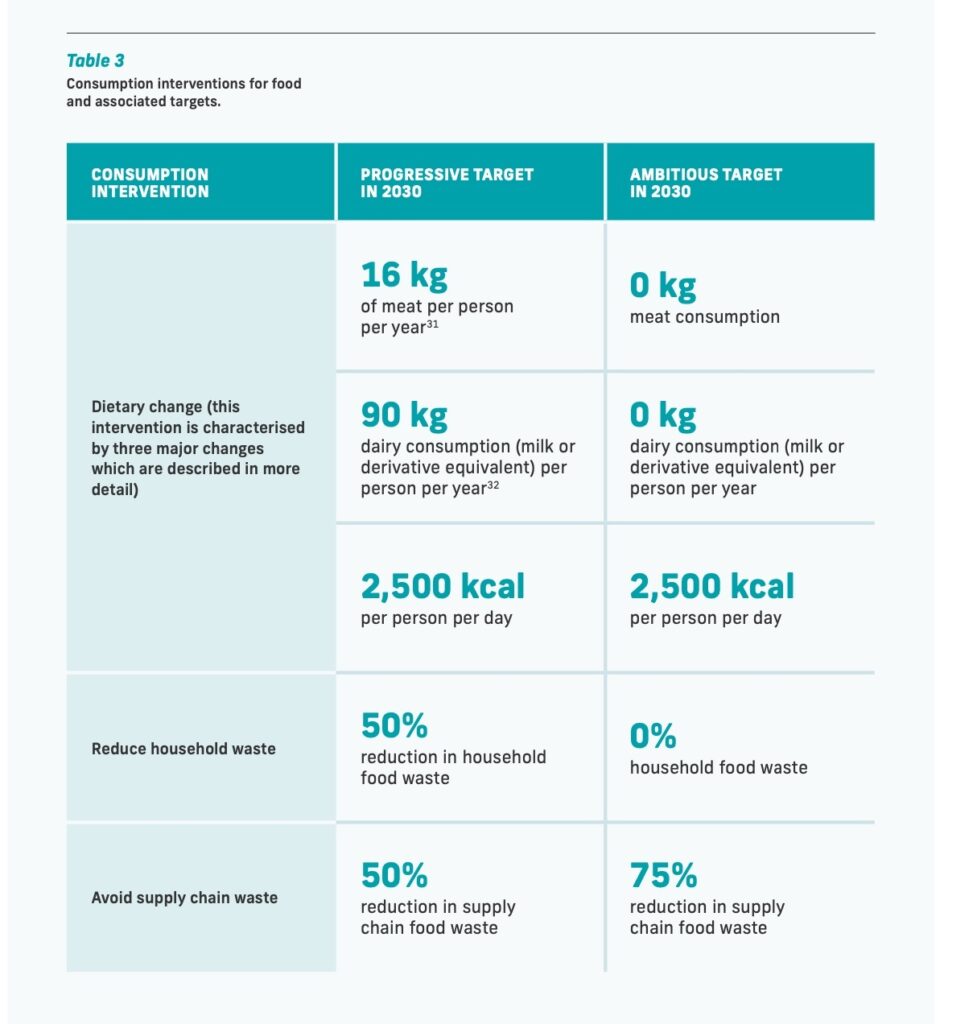 The report prescribes various “consumption interventions”, without outlining how these measures would be implemented. Reducing meat consumption to zero by 2030 is a listed target, but there is little in the way of detail about how this intervention could be achieved.