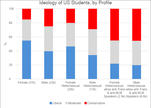 The chart below shows that the 31,000 female students in the survey (nearly all aged 18-22) lean 55% liberal to just 15% conservative, whereas the 22,000 male students lean liberal by 40% to 25%. A possible reason for the gap is that 32% of female students are lesbian, bisexual or queer, while just 20% of males are. If we focus only on heterosexual students, women go from 55-15 to 46-20, narrowing the gender gap somewhat.