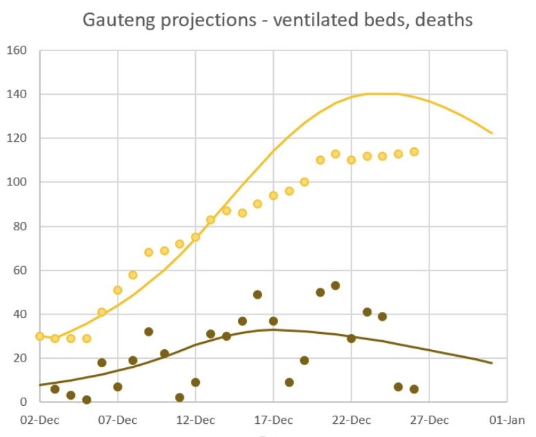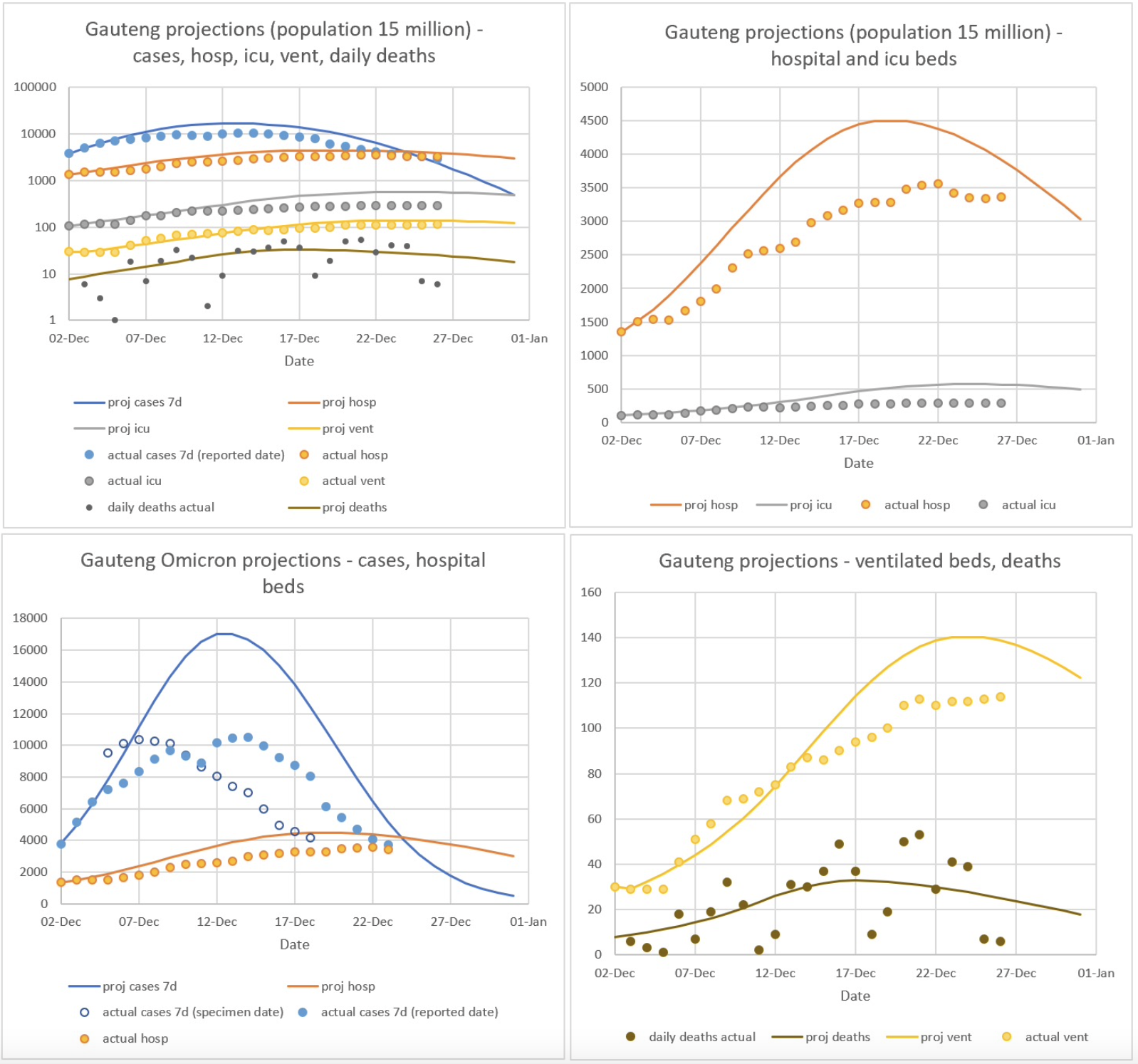 On 4th of December I put together some basic projections for all the main Omicron variables — cases, hospital beds, ICU beds, ventilated beds, deaths — using simple growth rate extrapolations. Each variable goes through an exponential phase during which daily growth peaks, followed by a period with a consistent decline in growth rate. This consistent decline makes it possible to predict the date of the peak with reasonable accuracy. Once a likely date range for a variable has been determined, it becomes easier to gauge the likely peak levels of all variables. It was clear already by then that the Omicron wave was going to be extremely mild compared to the Delta wave, which my forecasts confirmed.