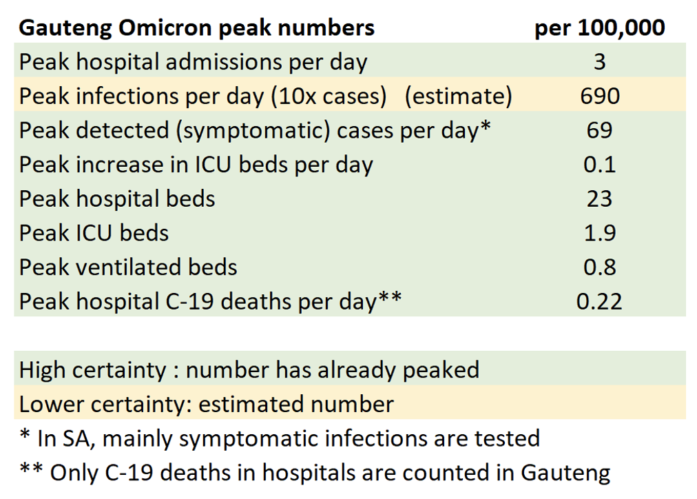 In fact, the Omicron wave in Gauteng turned out to be even milder than my forecasts suggested; since the interview, every single one of the variables came in below projected levels. My estimate that deaths would be 25 times lower than the Delta wave still holds, and I have revised my estimate for the infection fatality rate down from 0.053% (11th December) to 0.036%.