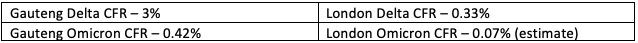 Now that the cases have peaked in London (since 23rd December in fact) and the hospital variables are in decline, it is possible to compare peak levels between London and Gauteng province in South Africa, where the Omicron wave began. There are very real differences between the two cities: Gauteng has relatively high prior infection levels and low vaccination rates, while London has lower prior infection rates and high vaccination rates. Gauteng has a younger population compared to London. Despite all this, the Case Fatality Rate (CFR) dropped 5-7-fold in both areas between Delta and Omicron.