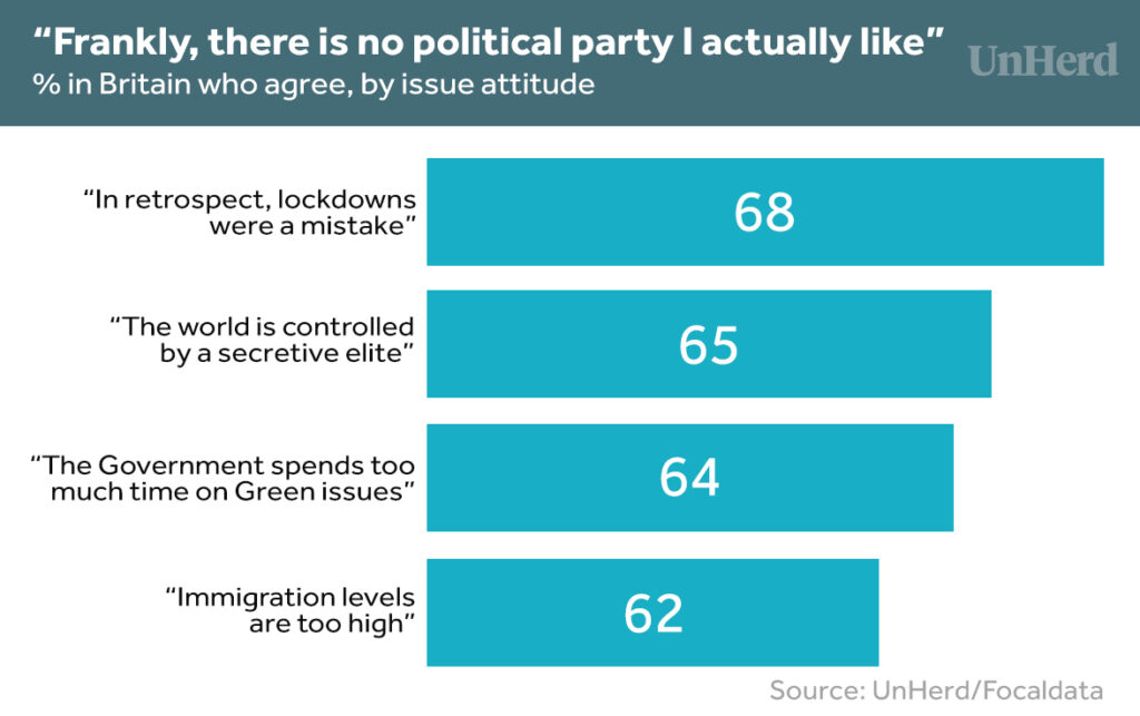 Close to six in 10 Britons say that there is no political party they like, according to the latest polling from UnHerd Britain. 58% of voters agree with the statement, “Frankly, there is no political party I actually like.” Just 22% indicate that they like what’s on offer. This is a resounding “none of the above” rejection of the Westminster Inn’s political menu.