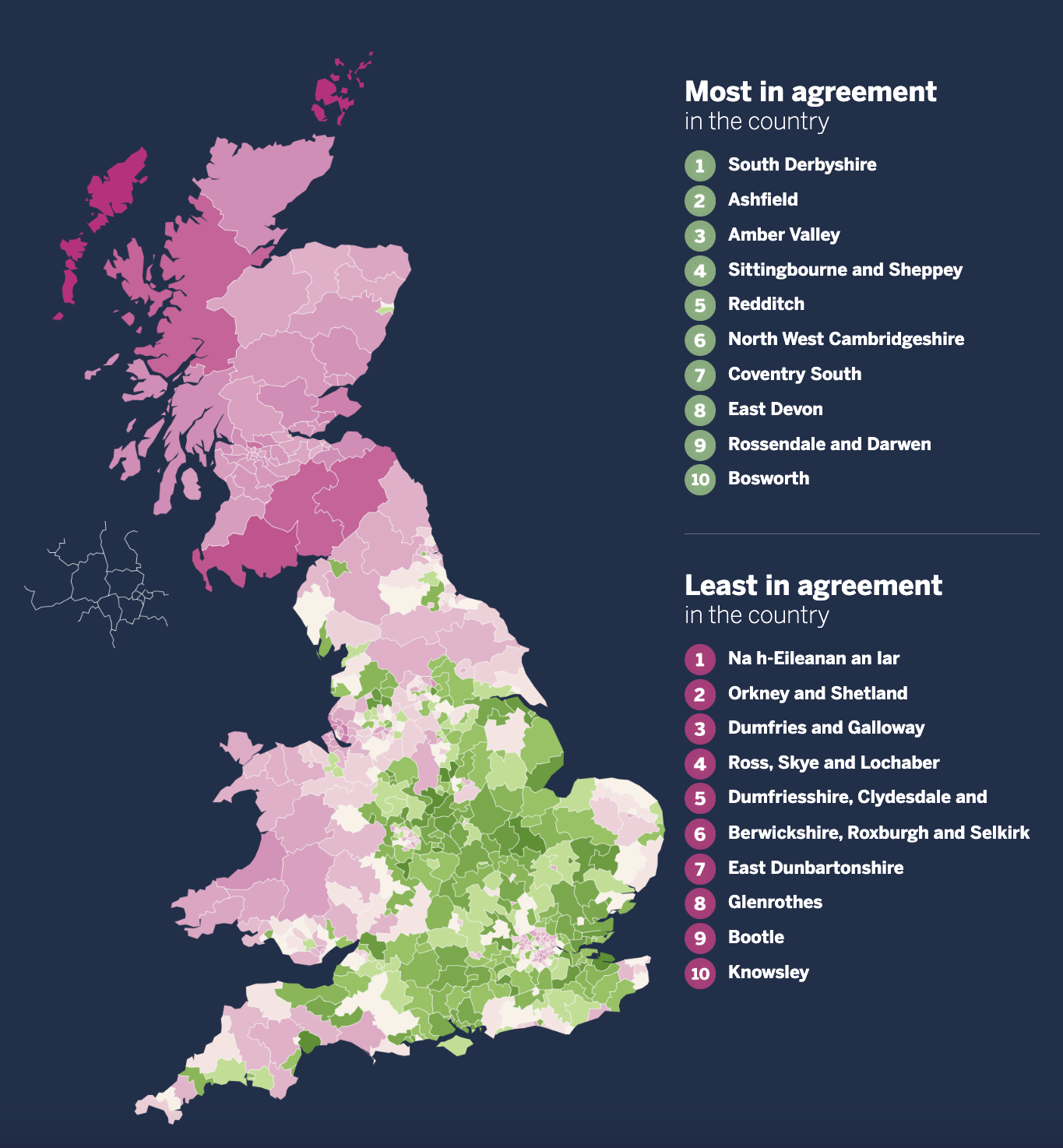 The map below shows the constituencies that deviate from the average in each direction, confirming the picture that non-metropolitan England feels the least well represented; however it should be emphasised that, while the residents of South Derbyshire or Amber Valley in the East Midlands are less enthusiastic about their choices (66%) than voters in Orkney and Shetland (52%), the typical constituency deviates by just 2% around the national average on this question. A map that showed the overall result would be an unbroken sea of green — representing political disenchantment across the land.