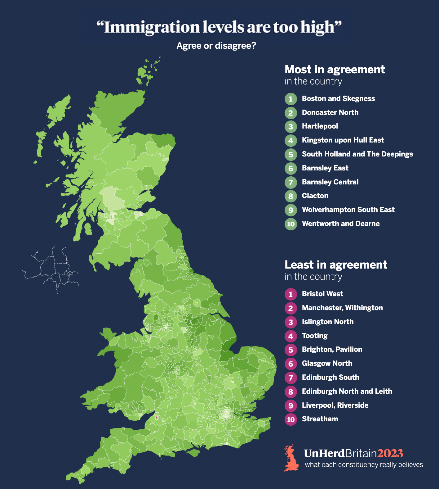 Boston and Skegness was the constituency that most strongly agreed immigration levels are too high, mirroring previous UnHerd Britain polling which revealed it was the only constituency in the UK that doesn’t regret Brexit.