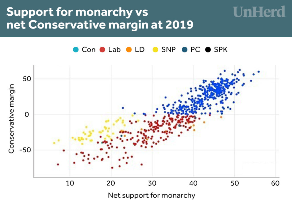 By contrast, all but one of the most monarchy-sceptic seats are held by one of the traffic-light parties of SNP, Plaid, Green or Labour, with the exception of the hyper-marginal Tory seat of Cities of London and Westminster. The Conservatives are on average 36 points behind the winner in these, an almost perfect inversion of the monarchist seats. Still, over half of Green, Liberal Democrat and Plaid Cymru voters all support the monarchy: 52%, 60% and 56% respectively.