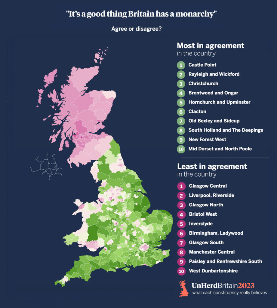Our polling looked at responses from 10,000 voters and used MRP to produce estimates for all 632 constituencies in Great Britain, excluding the Northern Irish constituencies which are more difficult to estimate in such a way. All 632 contain more supporters of the monarchy than those who disagreed with our question. Even in Glasgow Central, Britain’s most republican constituency, 31% think that the monarchy is not a good thing, compared to 37% who think it is.