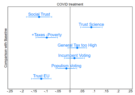 The differences between the two groups suggest that having Covid on our minds does indeed change our political preferences. For instance, compared to the baseline, we see higher levels of support for incumbent parties and correspondingly lower levels for populist parties. However, some of the other effects were much bigger; for instance the decline of trust in the European Union (and the increase of trust in science).