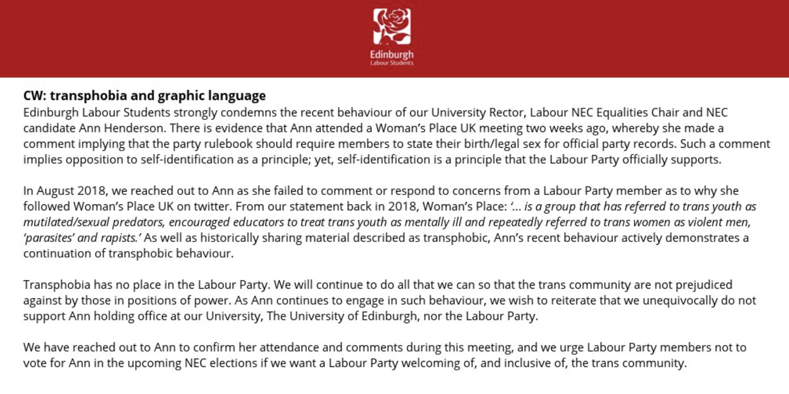 But all that was ignored by Edinburgh Labour Students when they uncovered evidence that Henderson had attended a Woman’s Place UK meeting two weeks previously. In an egregious statement that has since been taken down (screenshot below), they accused her of transphobic behaviour and insinuated that her actions were prejudicial to the trans community.