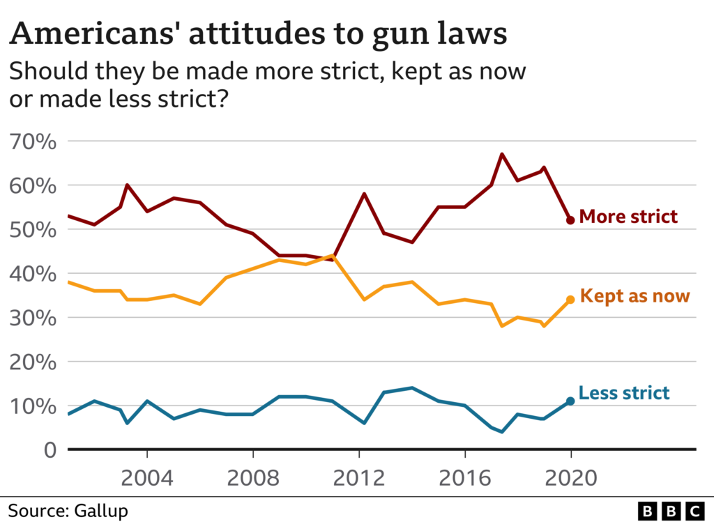 And yet another chart, based on Gallup polling, shows a decade-long increase in US voter support for gun control. While around half were in favour of stricter laws in 2008, that had risen to two-thirds in 2018. Spurred by atrocities like the Sandy Hook Elementary School shooting in 2012 and the Charleston church shooting in 2015, it really did seem as if a head of steam was building up for change.