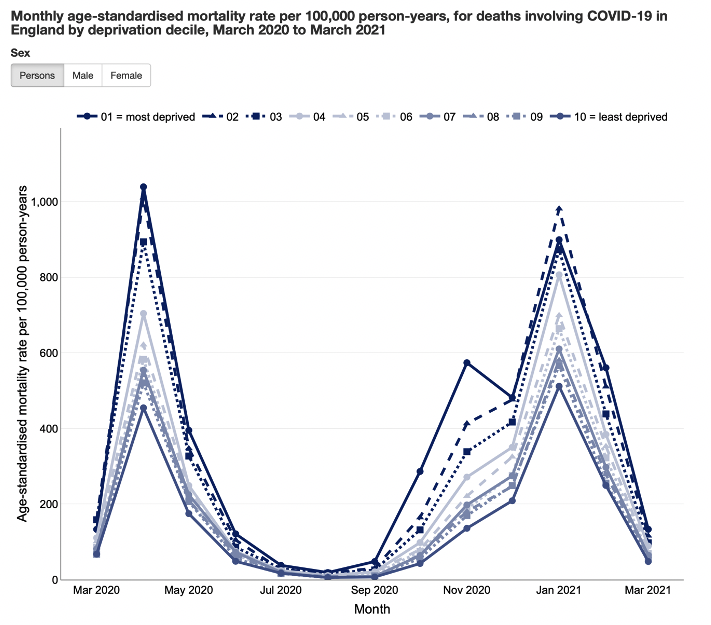 Sadly, the middle-class focus in the media has been reflected in the Government’s Covid policy too. Much of the political response to Covid has ignored the lack of pay to isolate, and inadequate sick pay — especially for those in casual employment — often to the detriment of the overall pandemic response. Indeed, one study showed that 67% of those in insecure jobs reported receiving no sick pay, which may be why another study found only 18% of those who had symptoms self-isolated. Most damning of all, Public Health England revealed last week that as the decile of deprivation went up, deaths from Covid soared correspondingly.