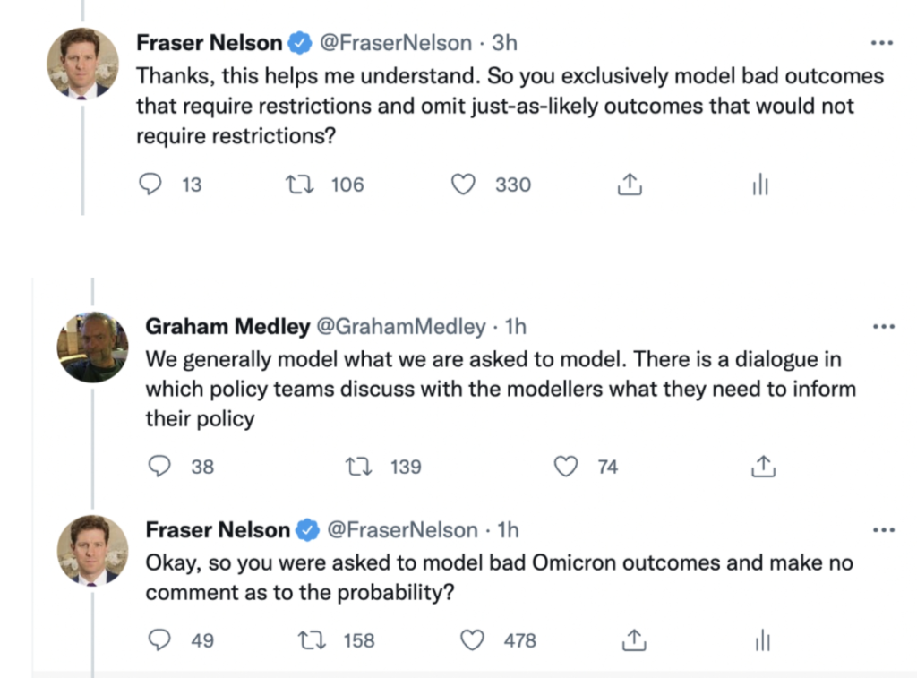 So what purpose do these models serve? Why are they always so gloomy? And why does there always seem to be little acknowledgement of how badly wrong they have been in the past? An illuminating Twitter exchange between Fraser Nelson, editor of The Spectator and Graham Medley, chairman of the SAGE modelling committee, SPI-M, may hold some of the answers. In the exchange, Professor Medley explained that the models produced by SAGE were “not predictions”; rather than models produced for a broad range of eventualities, their remit was far more limited. Policymakers discuss ‘with modellers what they need to inform their policy’ and models are created on the back of such discussions. Therefore, models are produced to ‘support a decision’ made by policymakers, rather than on the likelihood or plausibility of an event.