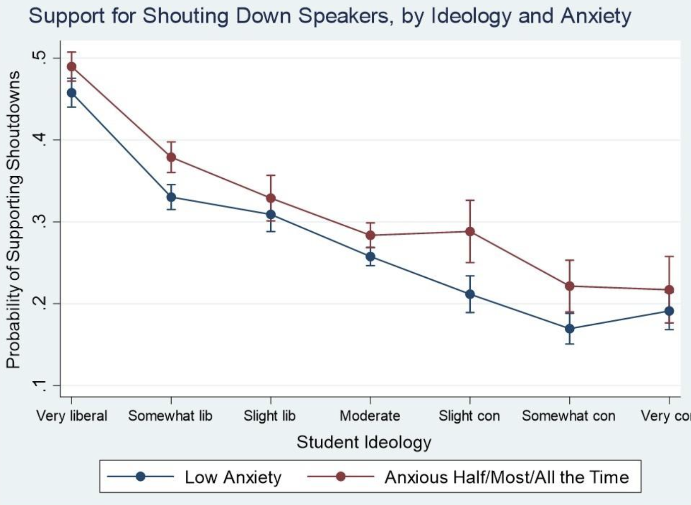 The net result is that, when comparing these two factors, almost all the variation in willingness to shout down a speaker is explained by ideology, not anxiety. Nearly one in two very liberal students support shoutdowns, and even one in five strong conservatives do. The dominance of ideology over mental health also holds when depression is swapped for anxiety, or when different measures of cancel culture are used. Mentally ill students, whether liberal or conservative, are somewhat more censorious than their well-adjusted peers, but this doesn’t make much difference to the overall level of cancel culture.