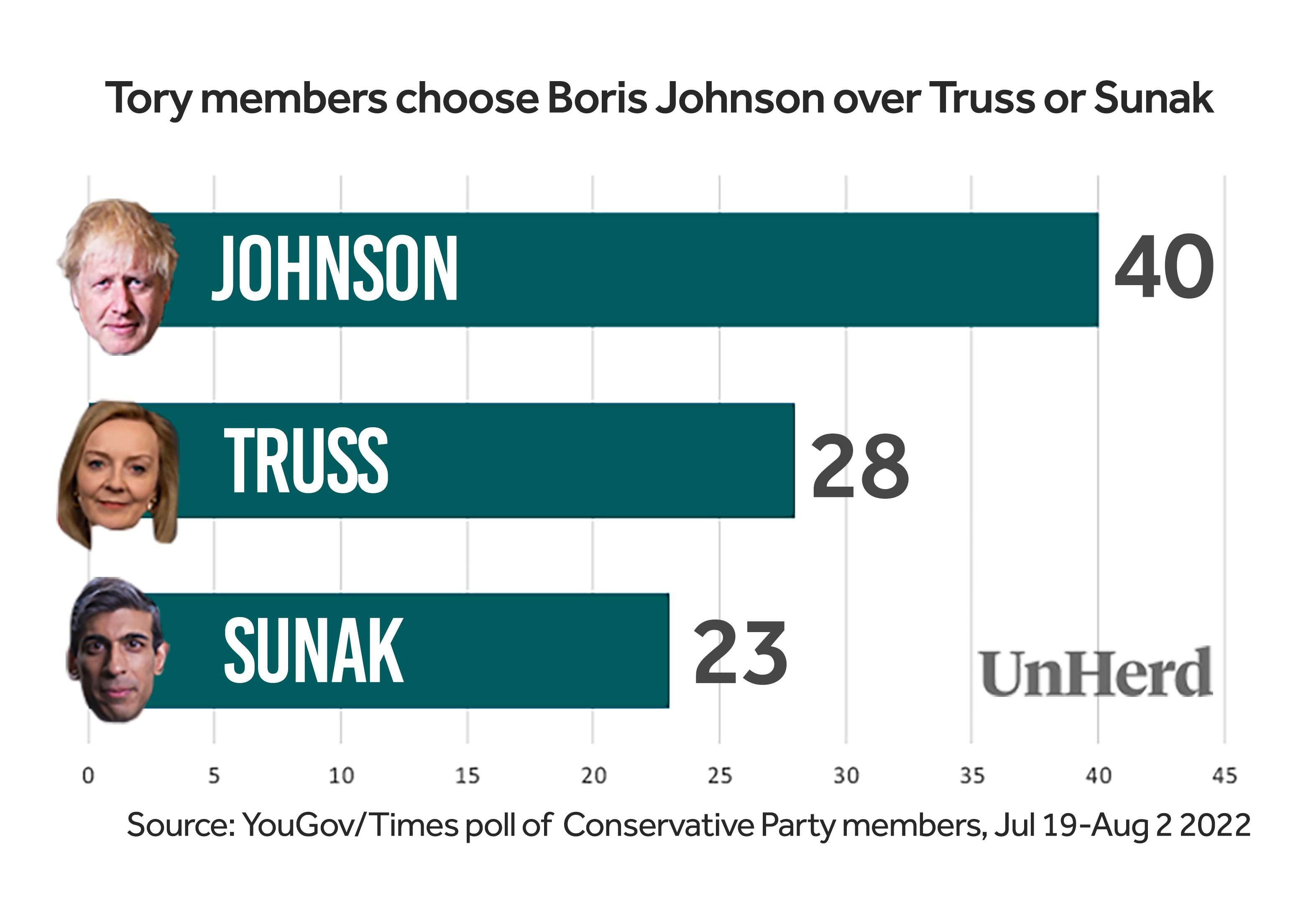 The latest YouGov/Times poll of Conservative members reveals that, if Boris Johnson was included on the ballot he would be far out ahead of both frontrunner Liz Truss and former Chancellor Rishi Sunak. 40% of Tory members would choose Johnson, over 28% for Truss and 23% for Sunak.